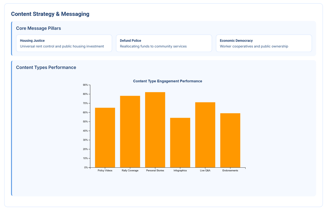 On Instagram and TikTok, personal stories were the heart of Mamdani’s outreach strategy. These videos and posts featured New Yorkers describing how housing costs, access to transit, or debt affected their lives. Mamdani often appeared alongside them, reinforcing empathy and accountability. This type of content achieved the highest engagement rate, at 12.3 percent, and a conversion rate of 3.7 percent, demonstrating that personal storytelling fosters emotional connection and credibility. It also allowed the campaign to humanize policy discussions and present Mamdani not as a distant politician but as a listener and advocate who stood with the people he represented.