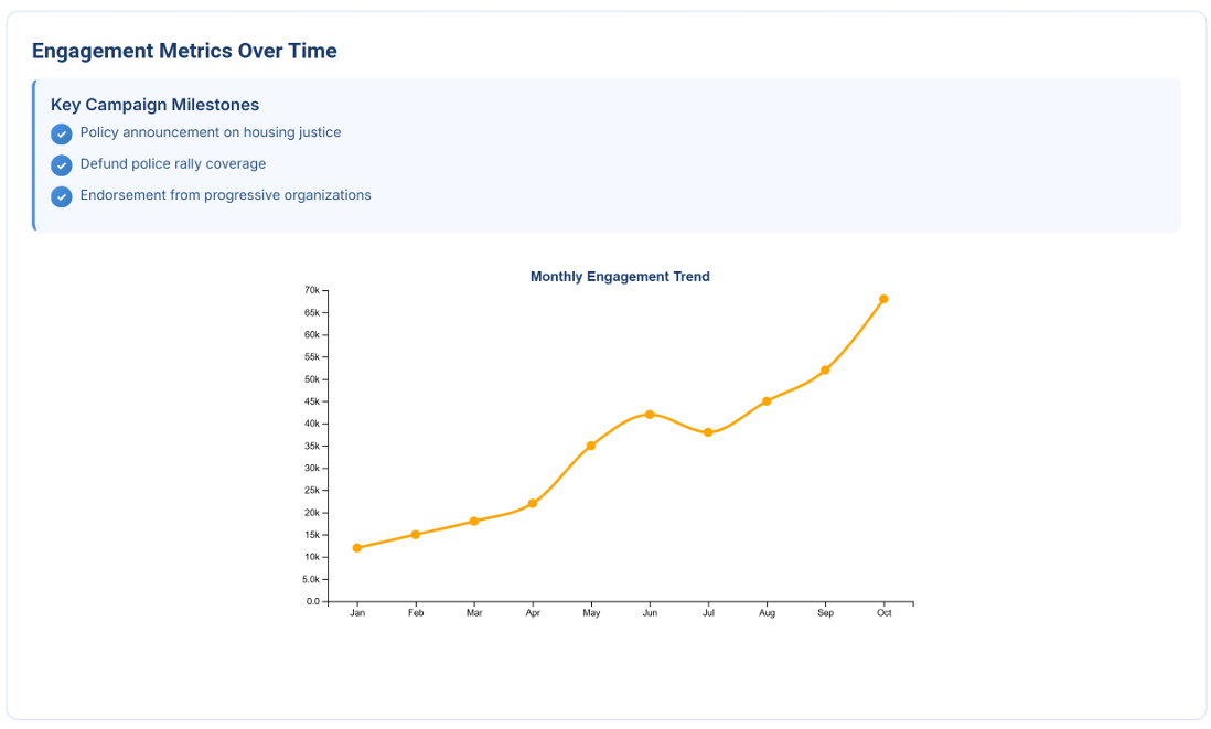 Collaborations with local activists, community leaders, and progressive creators expanded credibility and extended campaign reach to new audience segments.