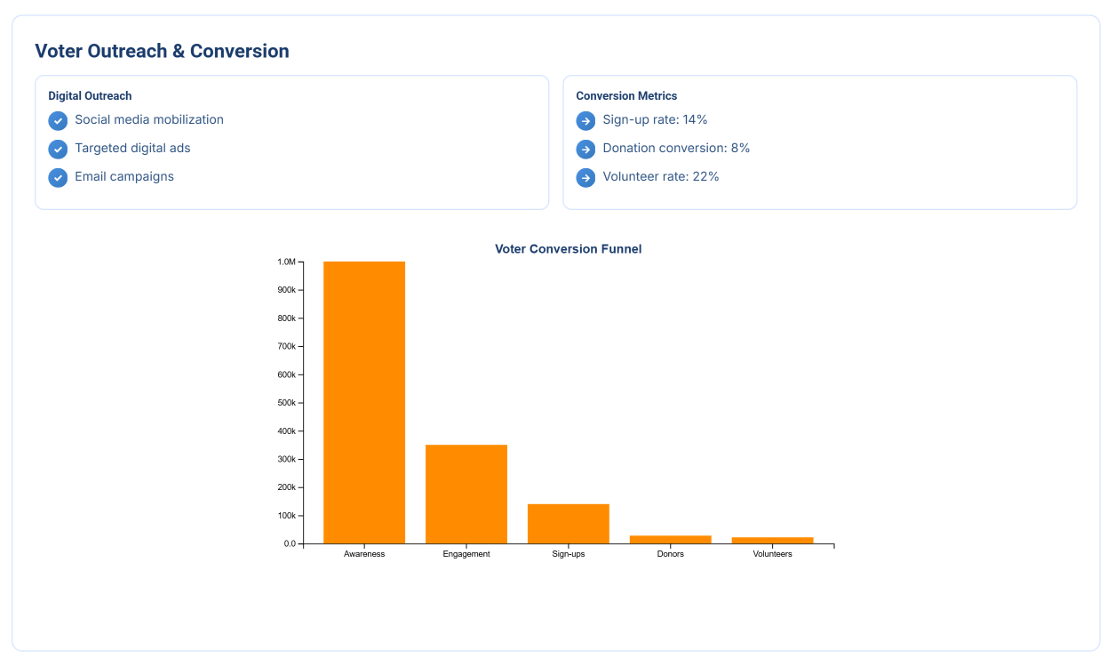 Facebook and email campaigns were used to mobilize supporters into action. These messages invited residents to volunteer, host events, or join neighborhood groups. With a modest engagement rate of 3.5 percent but a high conversion rate of 8.9 percent, this content played a crucial role in transforming passive supporters into organizers. The success stemmed from targeted communication; each message was localized, action-oriented, and easy to follow. Volunteers received clear next steps, which created a smooth path from interest to participation.