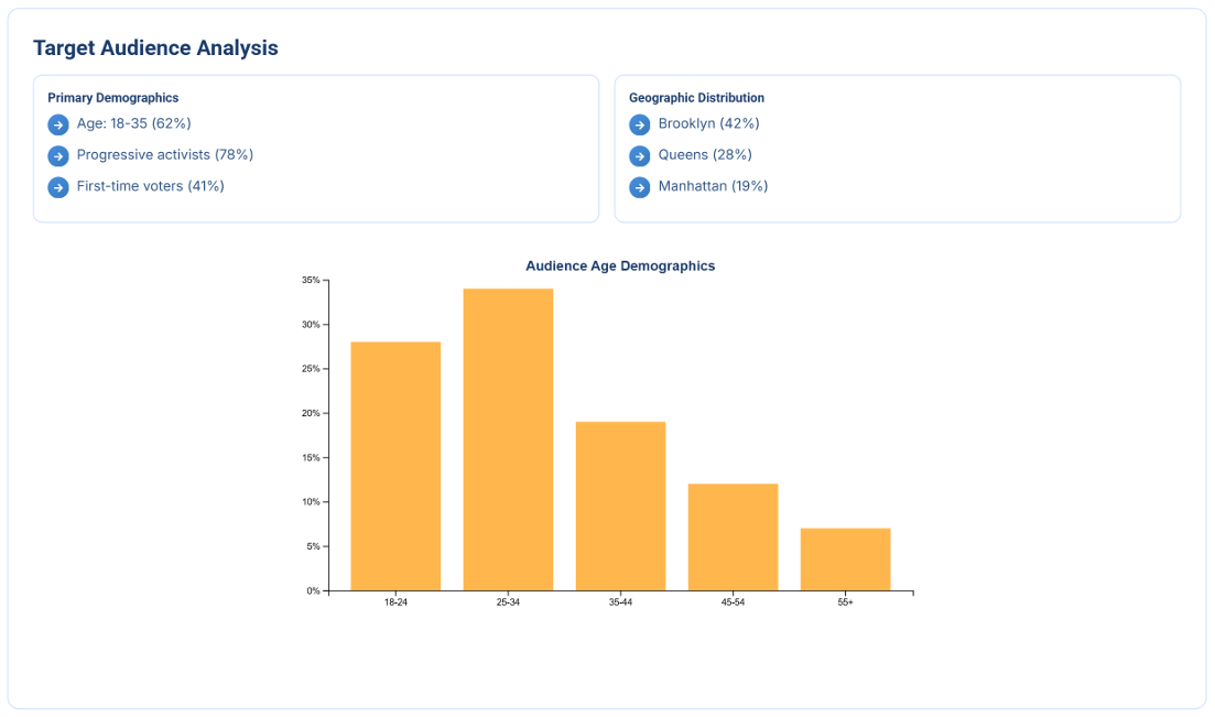 Zohran Mamdani’s campaign used policy explainers primarily on Twitter and Facebook to simplify complex policy issues into clear, relatable messages. These posts connected everyday experiences, such as rent increases or transit delays, to systemic solutions like public investment and reform. The average engagement rate for these explainers was 4.8 percent, while 2.1 percent of viewers took action, such as visiting the campaign website or signing up for updates. The success of this content came from its clarity and timing. Each post was concise, backed by data, and shared during moments when public interest in city issues was high, turning awareness into measurable participation.